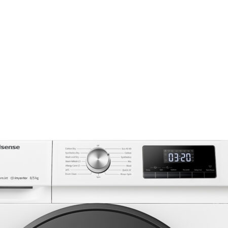 Hisense WDQA8014EVJM. Type lader: Voorbelading, Apparaatplaatsing: Vrijstaand, Kleur van het product: Wit. Droogcapciteit: 8 kg, Maximale centrifugesnelheid: 1400 RPM, Centrifuge-droger klasse: B. Deur openingshoek: 135°, Snoerlengte: 1,5 m. Energie-efficiëntieklasse (wassen): A, Energie-efficiëntieklasse (wassen en drogen): D, Water verbruik wassen: 42 l. Diepte: 540 mm, Breedte: 595 mm, Hoogte: 845 mm