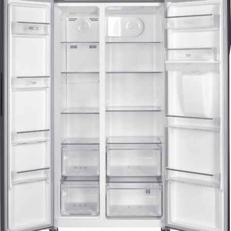 Beko GNO5322WDXPN. Apparaatplaatsing: Vrijstaand, Productontwerp: Amerikaanse deur, Kleur van het product: Roestvrijstaal. Totale nettocapaciteit: 532 l, Klimaatklasse: SN-ST, Geluidsemissieklasse: C. Nettocapaciteit koelkast: 344 l. Nettocapaciteit vriezer: 185 l, Vriezer positie: Ernaast, Vriescapaciteit: 14 kg/24u. Energie-efficiëntieklasse: E, Jaarlijks energieverbruik: 312 kWu, Energie-efficiëntieschaal: A tot G