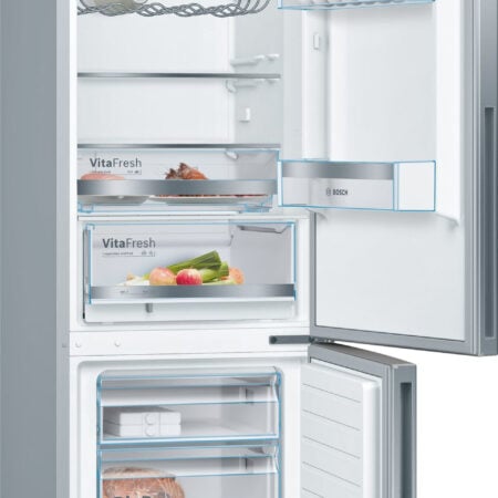 Bosch Serie 6 KGE39AICA. Totale nettocapaciteit: 343 l. Deurscharnieren: Rechts. Klimaatklasse: SN-T, Geluidsniveau: 38 dB. Nettocapaciteit koelkast: 249 l, Koelkast binnenverlichting, Aantal planken koelkast: 5, Aantal groente lades: 2. Nettocapaciteit vriezer: 94 l, Vriescapaciteit: 14 kg/24u. Vers zone compartiment. Energie-efficiëntieklasse: C, Jaarlijks energieverbruik: 149 kWu. Kleur van het product: Roestvrijstaal