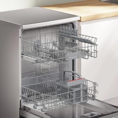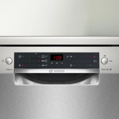 Bosch Serie 2 SMS25GI09F. Apparaatplaatsing: Vrijstaand, Productafmeting: Volledige grootte (60 cm), Deurkleur: Roestvrijstaal. Aantal couverts: 12 couverts, Geluidsemissieklasse: C, Geluidsniveau: 46 dB. Voetenverstelling: 2 cm. Energie-efficiëntieklasse: E, Waterconsumptie per cyclus: 9,5 l, Energieverbruik per 100 cycli: 92 kWu. Breedte: 600 mm, Diepte: 600 mm, Hoogte: 845 mm