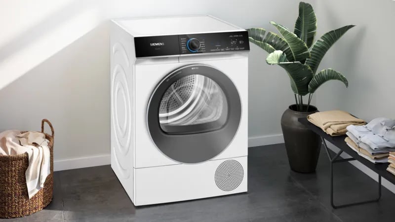 Siemens iQ700 WQ46B2D41, Vrijstaand, Voorbelading, Warmtepomp, Wit, Draaiknop, Touch, Links