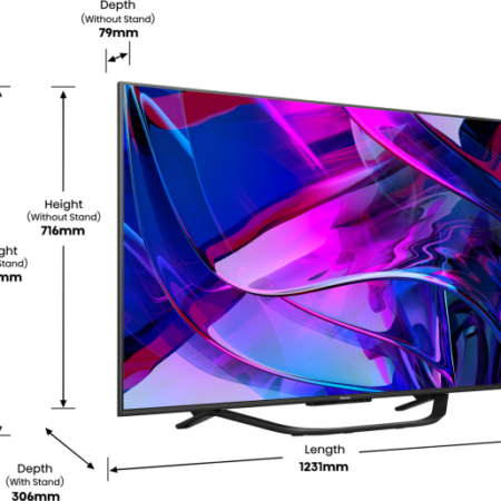Hisense 55U7KQTUK. Beeldschermdiagonaal: 139,7 cm (55″), Resolutie: 3840 x 2160 Pixels, HD type: 4K Ultra HD, Display technologie: Mini LED. Smart TV. Motion interpolation frequentie: 120 Hz, Helderheid: 900 cd/m², Responstijd: 6 ms, Typische contrastverhouding: 5000:1, Oorspronkelijke beeldverhouding: 16:9. Formaat digitaal signaal: DVB-C, DVB-S2, DVB-T2. Wifi, Ethernet LAN. Kleur van het product: Zwart
