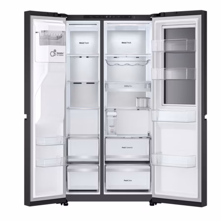 LG InstaView GSXE90EVAD. Apparaatplaatsing: Vrijstaand, Productontwerp: Amerikaanse deur, Kleur van het product: Zwart. Totale nettocapaciteit: 628 l, Klimaatklasse: T, Geluidsemissieklasse: B. Nettocapaciteit koelkast: 407 l, Koelkast temperatuurbereik: 1 – 7 °C, Soort lamp: LED. Nettocapaciteit vriezer: 221 l, Vriezer positie: Ernaast, Vriescapaciteit: 12 kg/24u. Vers zone compartiment bruto capaciteit: 45 l, Vers zone compartiment netto capaciteit: 44 l