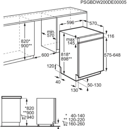 AEG FEE63606PM. Apparaatplaatsing: Volledig ingebouwd, Productafmeting: Volledige grootte (60 cm), Kleur bedieningspaneel: Zwart. Aantal couverts: 13 couverts, Geluidsemissieklasse: B, Geluidsniveau: 44 dB. Voetenverstelling: 7 cm. Energie-efficiëntieklasse: D, Waterconsumptie per cyclus: 10,5 l, Energieverbruik per 100 cycli: 84 kWu. Breedte: 596 mm, Diepte: 575 mm, Hoogte: 898 mm