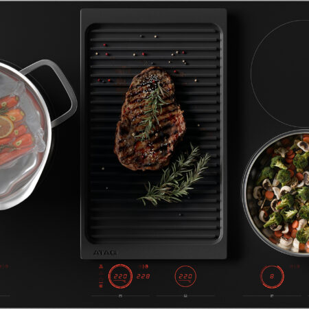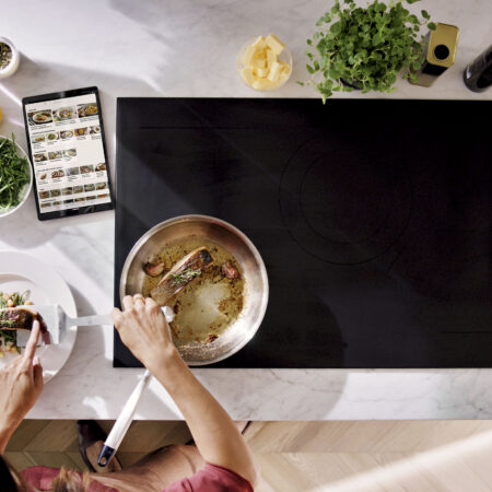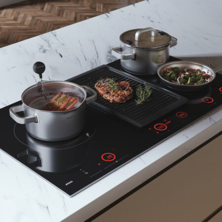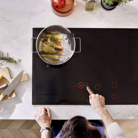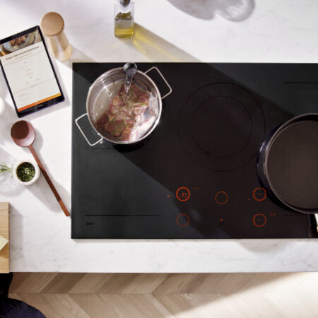 De inductiekookplaat met Celsius°Cooking™ kan communiceren met de afzuigkappen die uitgevoerd zijn met Hob-2-hood functie*. Diverse functies van de afzuigkap kunnen automatisch, maar ook handmatig worden bepaald. Het afzuigniveau, verlichting instellingen en meldingen zijn dan te zien en te bereiken via het centrale touch display op de inductiekookplaat.