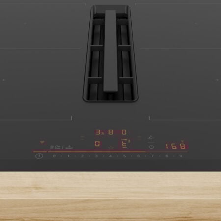 Bosch Serie 6 PVQ731H26E. Kleur van het product: Zwart, Apparaatplaatsing: Ingebouwd, Breedte kookplaat: 71 cm. Soort bediening: Touch, Controle positie: Front / Top front, Type timer: Digitaal. Afzuigmethode: Afvoerend/recirculerend, Maximale afzuigcapaciteit: 500 m³/uur, Geluidsniveau ventilatie (max): 69 dB. Aangesloten lading (elektrisch): 7400 W, AC-ingangsspanning: 220-240 V, AC-ingangsfrequentie: 50-60 Hz. Breedte: 710 mm, Diepte: 522 mm, Hoogte: 223 mm