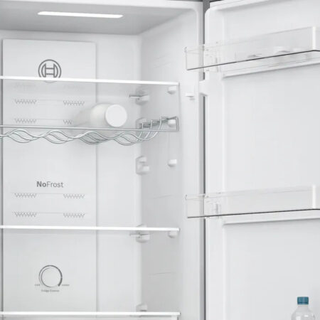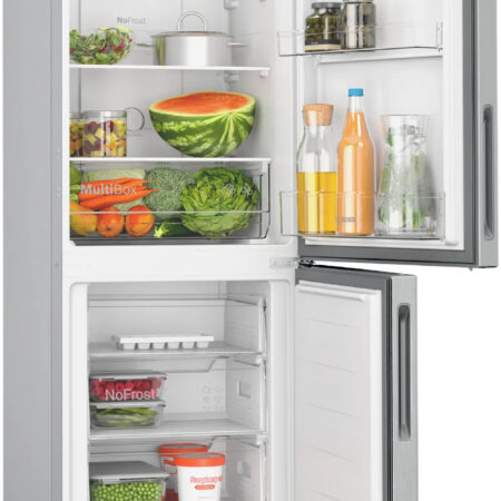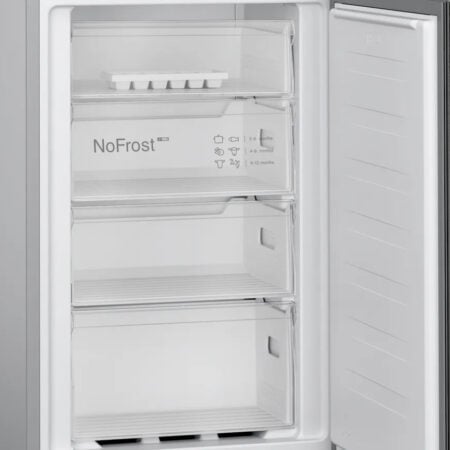 Bosch Serie 2 KGN27NLEA. Totale nettocapaciteit: 255 l. Deurscharnieren: Rechts. Klimaatklasse: SN-ST, Geluidsniveau: 41 dB. Nettocapaciteit koelkast: 171 l, No Frost (koelkast), Koelkast binnenverlichting, Aantal planken koelkast: 3, Aantal groente lades: 1. Nettocapaciteit vriezer: 84 l, Vriescapaciteit: 5,5 kg/24u, No Frost (vriezer). Energie-efficiëntieklasse: E, Jaarlijks energieverbruik: 229 kWu. Kleur van het product: Roestvrijstaal