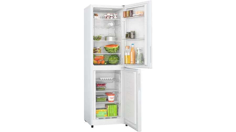 Bosch Serie 2 KGN27NWEA. Totale nettocapaciteit: 255 l. Deurscharnieren: Rechts. Klimaatklasse: SN-ST, Geluidsniveau: 41 dB. Nettocapaciteit koelkast: 171 l, No Frost (koelkast), Multi-luchtwegsysteem (koelkast), Koelkast binnenverlichting. Nettocapaciteit vriezer: 84 l, Vriescapaciteit: 5,5 kg/24u, No Frost (vriezer). Vers zone compartiment. Energie-efficiëntieklasse: E, Jaarlijks energieverbruik: 229 kWu. Kleur van het product: Wit