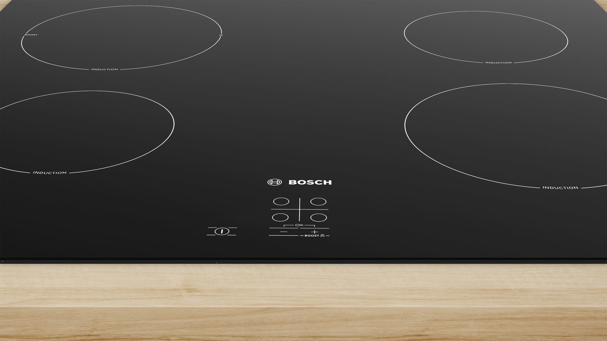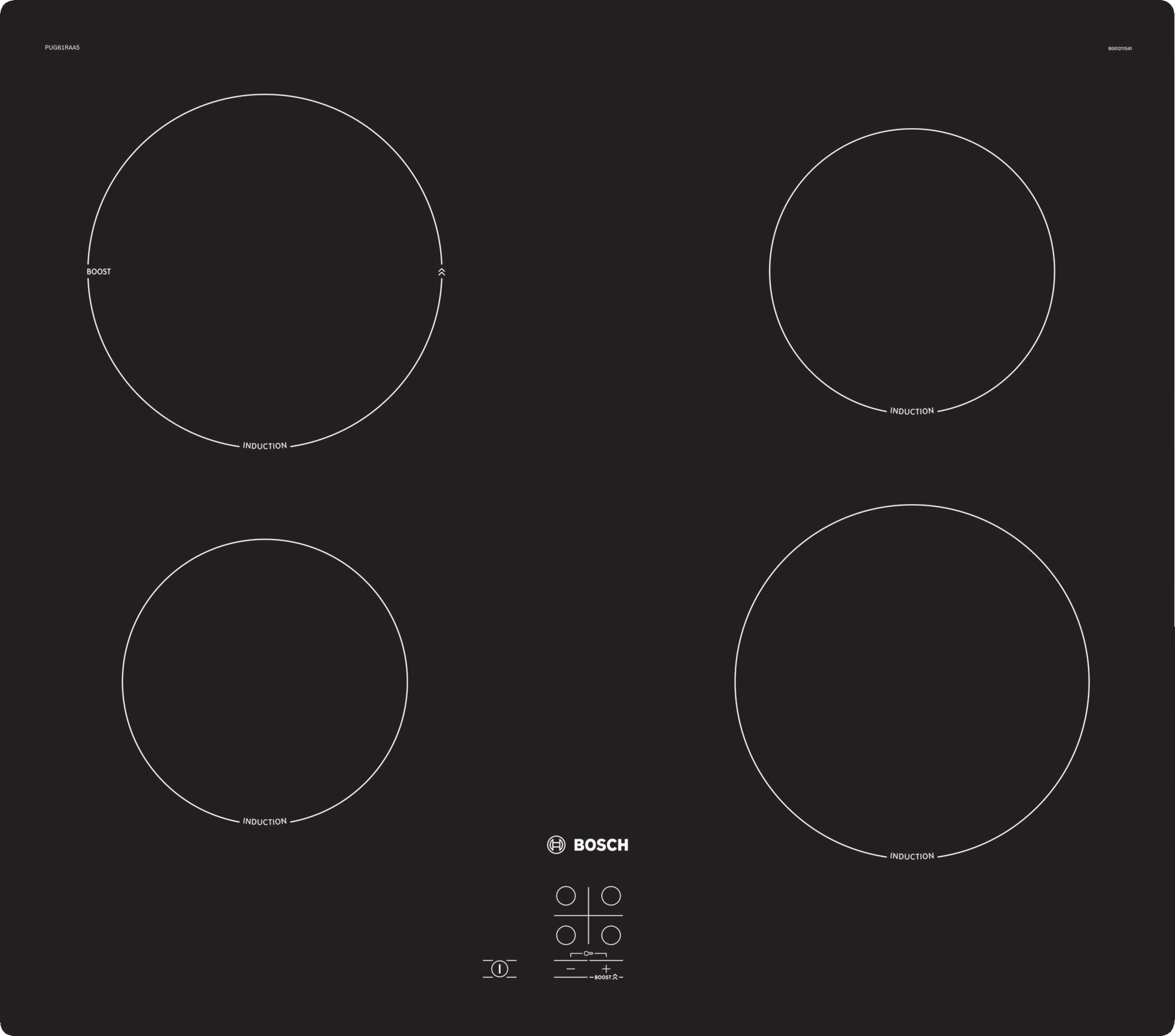 Bosch Serie 2 PUG61RAA5B, Zwart, Ingebouwd, 60 cm, Inductiekookplaat zones, Keramisch, 4 zone(s)