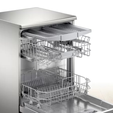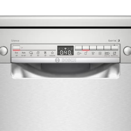 Bosch Serie 2 SMS2HVI72E. Apparaatplaatsing: Vrijstaand, Productafmeting: Volledige grootte (60 cm), Deurkleur: Roestvrijstaal. Aantal couverts: 13 couverts, Geluidsemissieklasse: C, Geluidsniveau: 46 dB. Energie-efficiëntieklasse: E, Waterconsumptie per cyclus: 9,5 l, Energieverbruik per 100 cycli: 94 kWu. Breedte: 600 mm, Diepte: 600 mm, Hoogte: 845 mm