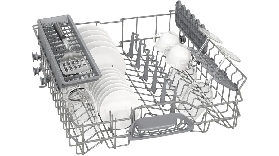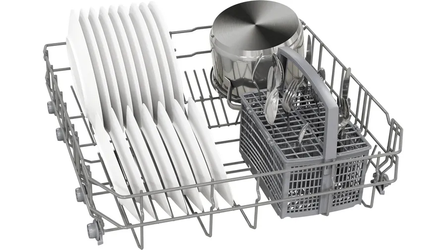 Bosch Serie 2 SMV2HTX02G. Apparaatplaatsing: Volledig ingebouwd, Productafmeting: Volledige grootte (60 cm), Kleur bedieningspaneel: Zwart. Aantal couverts: 13 couverts, Geluidsemissieklasse: C, Geluidsniveau: 46 dB. Voetenverstelling: 6 cm. Energie-efficiëntieklasse: D, Waterconsumptie per cyclus: 9 l, Energieverbruik per 100 cycli: 84 kWu. Breedte: 598 mm, Diepte: 550 mm, Hoogte: 815 mm