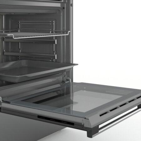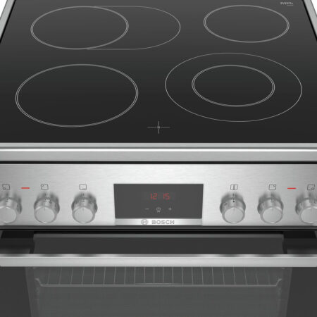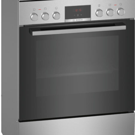 Bosch Serie 4 HKR39C250. Type product: Vrijstaand fornuis, Kleur van het product: Zwart, Grijs, Soort bediening: Draaiknop, Touch. Type kookplaat: Keramisch, Aantal branders/kookzones: 4 zone(s), Soort materiaal (bovenkant): Glaskeramiek. Grootte oven: Middelmaat, Voedingsbron oven: Electrisch, Netto capaciteit oven: 66 l. Energie-efficiëntieklasse: A, Energieverbruik (conventioneel): 0,98 kWu, Aangesloten lading (elektrisch): 10800 W. Breedte: 600 mm, Diepte: 600 mm, Hoogte: 850 mm