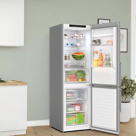 Bosch Serie 4 KGN36VICT. Totale nettocapaciteit: 321 l. Deurscharnieren: Rechts. Klimaatklasse: SN-T, Geluidsniveau: 35 dB. Nettocapaciteit koelkast: 218 l, No Frost (koelkast), Multi-luchtwegsysteem (koelkast), Koelkast binnenverlichting. Nettocapaciteit vriezer: 103 l, Vriescapaciteit: 9,5 kg/24u, No Frost (vriezer). Vers zone compartiment. Energie-efficiëntieklasse: C, Jaarlijks energieverbruik: 159 kWu. Kleur van het product: Roestvrijstaal