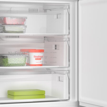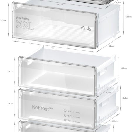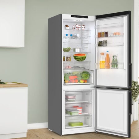 Bosch Serie 4 KGN49OXBT. Deurscharnieren: Rechts. Klimaatklasse: ST-T, Geluidsniveau: 35 dB. No Frost (koelkast), Koelkast binnenverlichting, Aantal planken koelkast: 5, Aantal groente lades: 1. Nettocapaciteit vriezer: 311 l, No Frost (vriezer). Vers zone compartiment. Energie-efficiëntieklasse: B, Jaarlijks energieverbruik: 142 kWu. Kleur van het product: Zwart