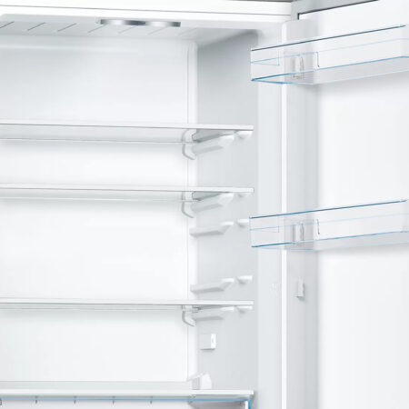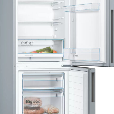 Bosch Serie 4 KGV332LEA. Totale nettocapaciteit: 289 l. Deurscharnieren: Rechts. Klimaatklasse: SN-T, Geluidsniveau: 39 dB. Nettocapaciteit koelkast: 195 l, Koelkast binnenverlichting, Aantal planken koelkast: 4, Aantal groente lades: 1. Nettocapaciteit vriezer: 94 l, Vriescapaciteit: 4,5 kg/24u. Energie-efficiëntieklasse: E, Jaarlijks energieverbruik: 228 kWu. Kleur van het product: Roestvrijstaal