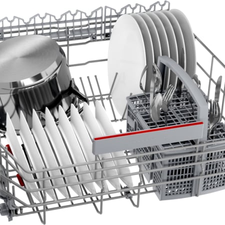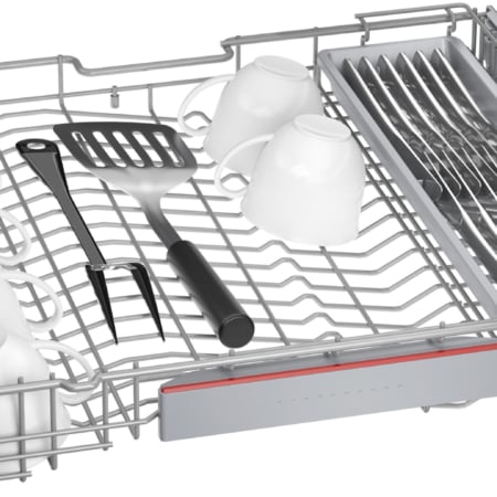 Het derde laadrek bovenin je vaatwasser biedt meer ruimte voor groot en klein keukengerei, lage kommen, maatbekers en nog meer. Dankzij de verplaatsbare messenlade kun je het derde laadrek ook gebruiken om meer te plaatsen in de korf eronder. Met meer ruimte voor klein keukengerei vind je voortaan overal een plekje voor.