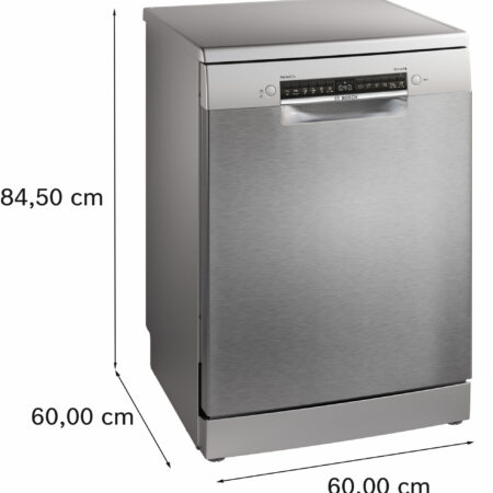 Bosch Serie 6 SMS6TCI00E. Apparaatplaatsing: Vrijstaand, Productafmeting: Volledige grootte (60 cm), Deurkleur: Roestvrijstaal. Aantal couverts: 14 couverts, Geluidsemissieklasse: B, Geluidsniveau: 44 dB. Voetenverstelling: 2 cm, Bedieningsapps ondersteund: Bosch Home Connect. Energie-efficiëntieklasse: A, Waterconsumptie per cyclus: 9,5 l, Energieverbruik per 100 cycli: 54 kWu. Breedte: 600 mm, Diepte: 600 mm, Hoogte: 845 mm