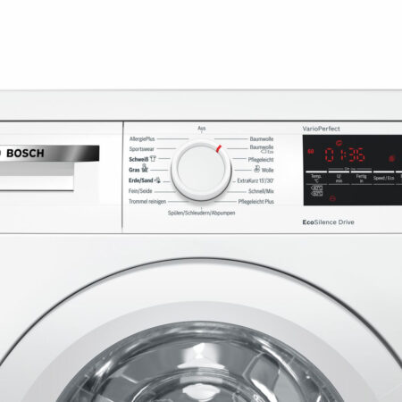 Bosch Serie 6 WUQ28420. Type lader: Voorbelading. Nominale capaciteit: 8 kg, Centrifuge-droger klasse: B, Geluidsniveau bij centrifugeren: 76 dB. Wasklasse: A. Geluidsniveau (wassen): 49 dB, Maximale centrifugesnelheid: 1400 RPM. Jaarlijkse energieverbruik wassen: 135 kWu, Jaarlijks waterverbruik wassen: 9680 l. Kleur van het product: Wit. Breedte: 598 mm, Diepte: 550 mm, Hoogte: 848 mm