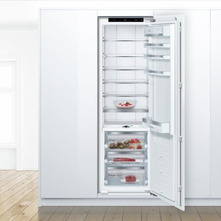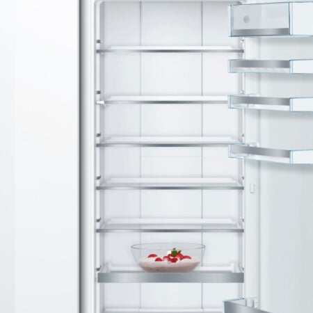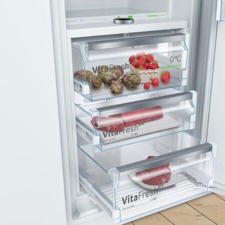 Bosch Serie 8 KIF81PFE0. Nettocapaciteit koelkast: 289 l, Klimaatklasse: SN-T, Geluidsniveau: 37 dB. Aantal planken koelkast: 7, Aantal groente lades: 2. Soort lamp: LED. Deurscharnieren: Rechts. Jaarlijks energieverbruik: 150 kWu, Energie-efficiëntieklasse: E. Gewicht: 69,4 kg