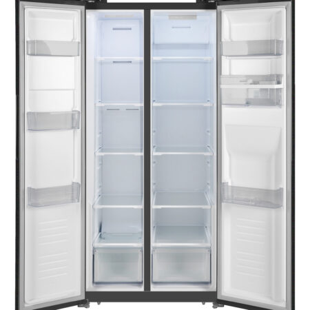 Fridgemaster MS83430DEB. Apparaatplaatsing: Vrijstaand, Productontwerp: Amerikaanse deur, Kleur van het product: Zwart. Totale nettocapaciteit: 440 l, Klimaatklasse: N-T, Geluidsemissieklasse: C. Nettocapaciteit koelkast: 267 l, Brutocapaciteit koelkast: 267 l, Soort lamp: LED. Nettocapaciteit vriezer: 173 l, Vriezer positie: Ernaast, Vriescapaciteit: 12 kg/24u. Energie-efficiëntieklasse: E, Jaarlijks energieverbruik: 288 kWu, Energie-efficiëntieschaal: A tot F