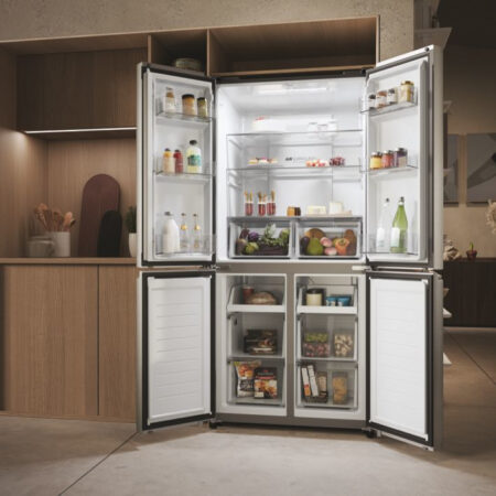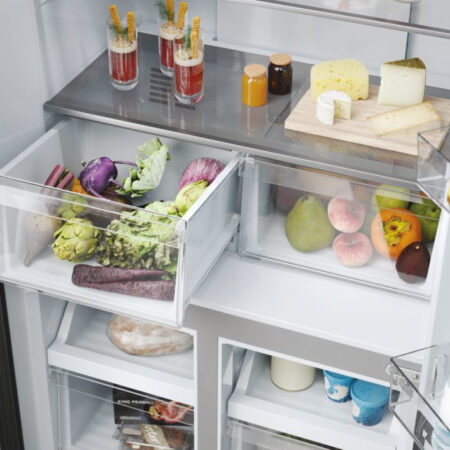 De koelkasten uit de Cube 83 vierdeurs serie zijn 83 cm breed en hebben een aantrekkelijk, modern ontwerp dat in iedere keuken past, terwijl de interne compartimenten kunnen worden aangepast aan jouw specifieke koelvereisten. De verticale koelkast- en vriezerdeuren zorgen voor een beter zicht op het voedsel binnenin. Dat betekent dat je minder tijd kwijt bent aan het zoeken naar producten, waardoor temperatuurschommelingen en energieverbruik worden verminderd en de kwaliteit van het voedsel langer bewaard blijft.