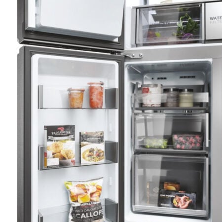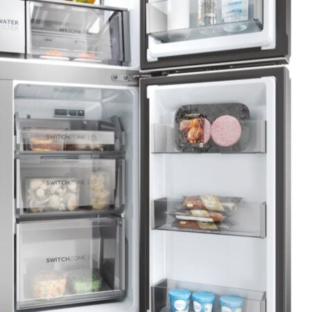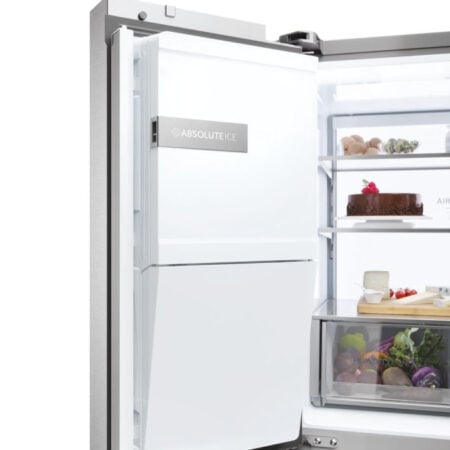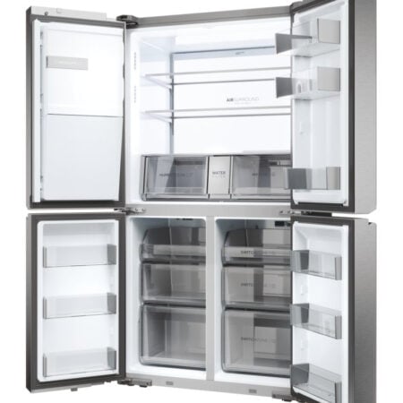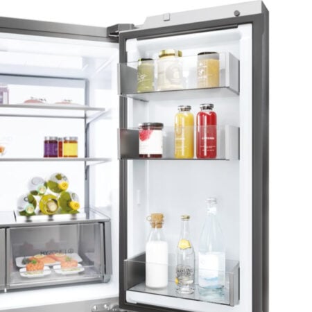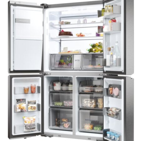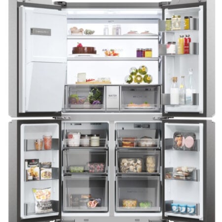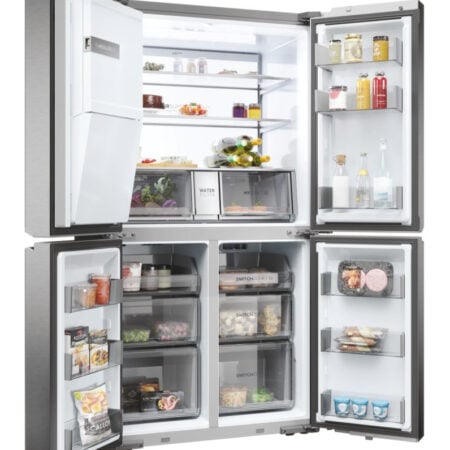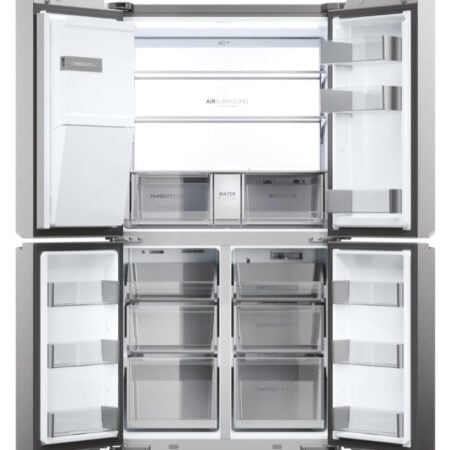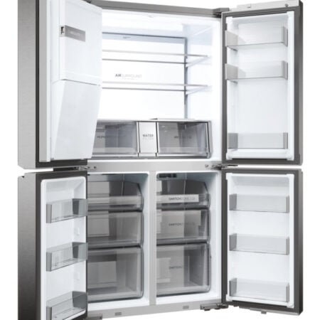 Haier HCR7918EIMP. Apparaatplaatsing: Vrijstaand, Productontwerp: Frans deur, Kleur van het product: Platina, Roestvrijstaal. Totale nettocapaciteit: 601 l, Klimaatklasse: ST, Geluidsemissieklasse: C. Nettocapaciteit koelkast: 323 l, Soort lamp: LED. Nettocapaciteit vriezer: 278 l, Vriezer positie: Onder, Vriescapaciteit: 6 kg/24u. Energie-efficiëntieklasse: E, Jaarlijks energieverbruik: 357 kWu, Energie-efficiëntieschaal: A tot G