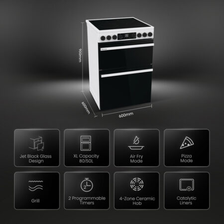 Hisense HDCEC6C20W. Type product: Vrijstaand fornuis, Kleur van het product: Wit, Soort bediening: Draaiknop. Type kookplaat: Keramisch, Aantal branders/kookzones: 4 zone(s), Soort materiaal (bovenkant): Keramisch. Grootte oven: Groot, Voedingsbron oven: Electrisch, Netto capaciteit oven: 80 l. Oven 2 afmetingen: Middelmaat, Oven 2 voedingsbron: Electrisch, Oven 2 netto capaciteit: 50 l. Energieverbruik (conventioneel): 0,81 kWu, Aangesloten lading (elektrisch): 10300 W, Oven 2 energieverbruik (traditioneel): 0,66 kWu