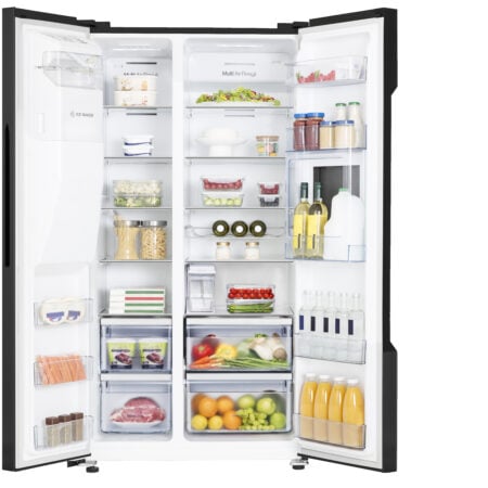Hisense RS694N4BBF. Apparaatplaatsing: Vrijstaand, Productontwerp: Amerikaanse deur, Kleur van het product: Zwart. Totale nettocapaciteit: 560 l, Klimaatklasse: SN-T, Geluidsemissieklasse: C. Nettocapaciteit koelkast: 369 l, Soort lamp: LED. Nettocapaciteit vriezer: 191 l, Vriezer positie: Ernaast, Vriescapaciteit: 11 kg/24u. Energie-efficiëntieklasse: F, Jaarlijks energieverbruik: 404 kWu, Netbelasting: 260 W