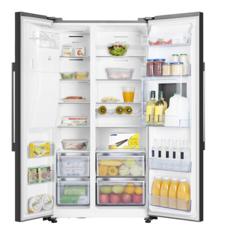 Hisense RS694N4BCE. Apparaatplaatsing: Vrijstaand, Productontwerp: Amerikaanse deur, Kleur van het product: Zwart. Totale nettocapaciteit: 562 l, Klimaatklasse: N-T, Geluidsemissieklasse: D. Nettocapaciteit koelkast: 371 l, Soort lamp: LED. Nettocapaciteit vriezer: 191 l, Vriezer positie: Ernaast, Vriescapaciteit: 13 kg/24u. Snoerlengte: 2 m