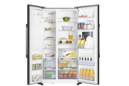 Hisense RS694N4BCE. Apparaatplaatsing: Vrijstaand, Productontwerp: Amerikaanse deur, Kleur van het product: Zwart. Totale nettocapaciteit: 562 l, Klimaatklasse: N-T, Geluidsemissieklasse: D. Nettocapaciteit koelkast: 371 l, Soort lamp: LED. Nettocapaciteit vriezer: 191 l, Vriezer positie: Ernaast, Vriescapaciteit: 13 kg/24u. Snoerlengte: 2 m