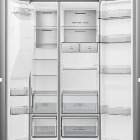 Hisense RS818N4IIE. Apparaatplaatsing: Vrijstaand, Productontwerp: Amerikaanse deur, Kleur van het product: Roestvrijstaal. Totale nettocapaciteit: 632 l, Klimaatklasse: N-T, Geluidsemissieklasse: C. Nettocapaciteit koelkast: 417 l, Soort lamp: LED. Nettocapaciteit vriezer: 215 l, Vriezer positie: Ernaast, Vriescapaciteit: 11 kg/24u. Snoerlengte: 2 m