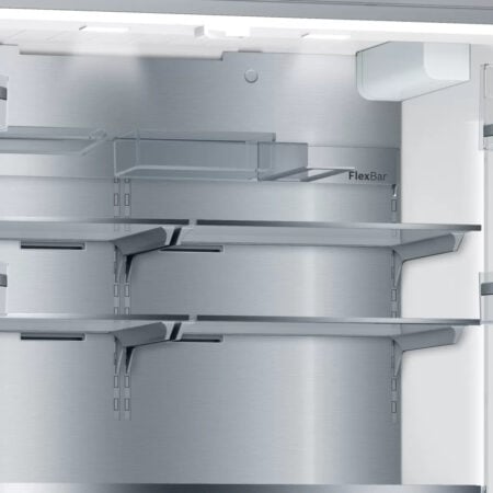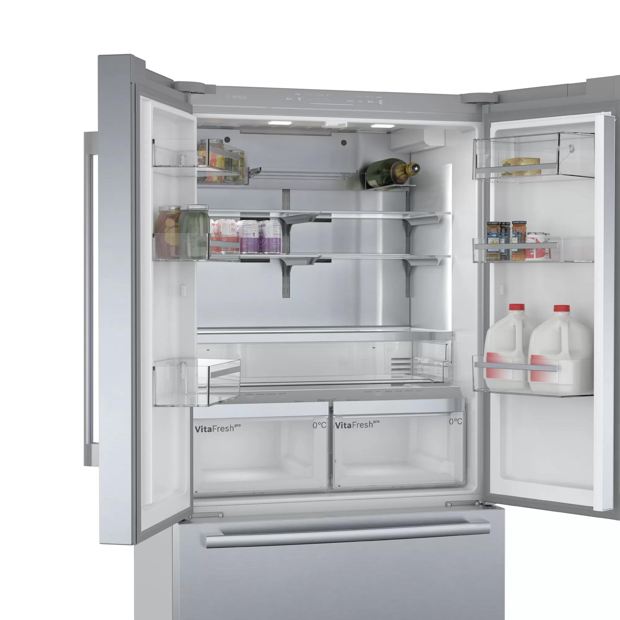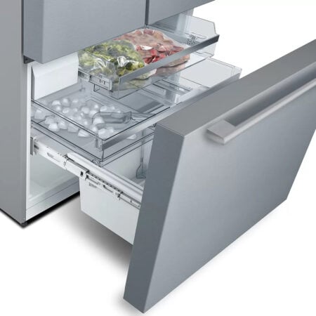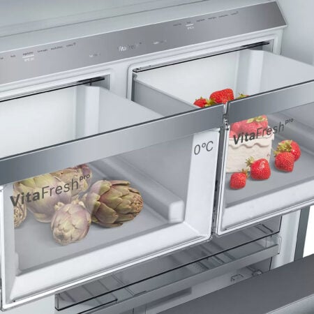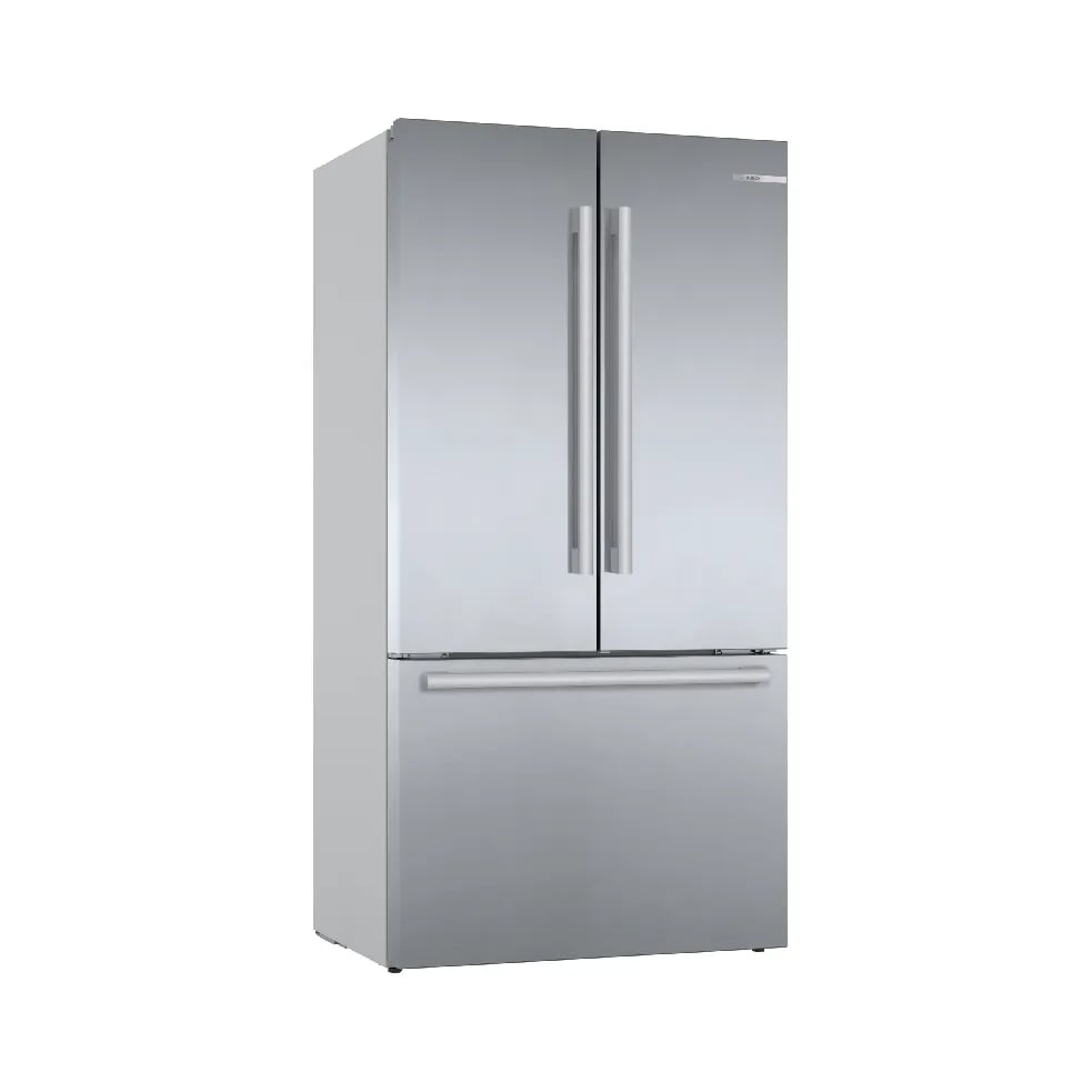 Bosch KFF96PIEP. Apparaatplaatsing: Vrijstaand, Productontwerp: Frans deur, Kleur van het product: Roestvrijstaal. Totale nettocapaciteit: 573 l, Klimaatklasse: SN-T, Geluidsemissieklasse: C. Nettocapaciteit koelkast: 402 l, Soort lamp: LED. Nettocapaciteit vriezer: 171 l, Vriezer positie: Onder, Vriescapaciteit: 15 kg/24u. Snoerlengte: 2,4 m