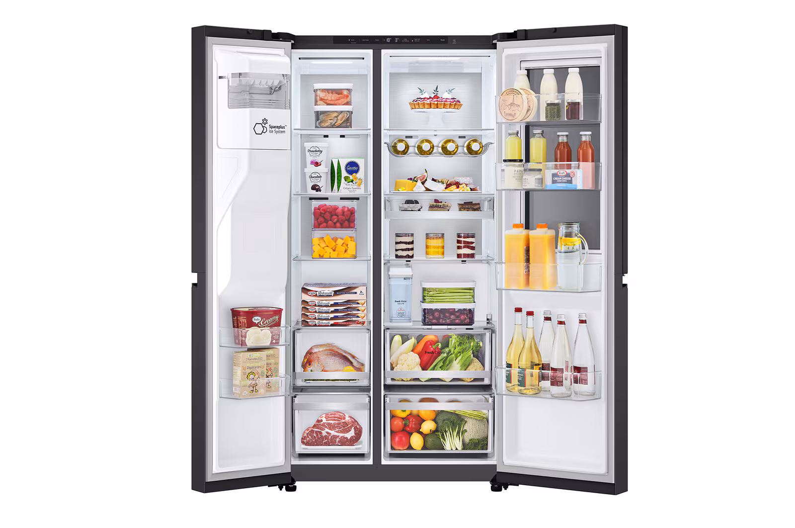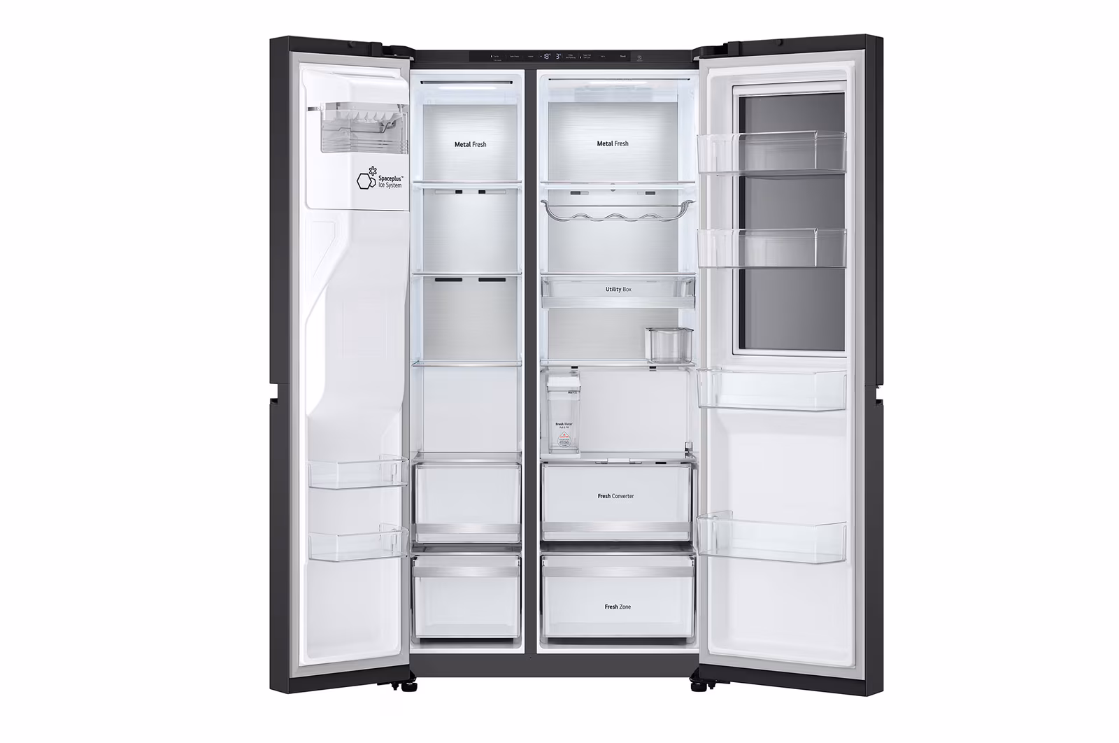 LG InstaView GSXE90EVAD. Apparaatplaatsing: Vrijstaand, Productontwerp: Amerikaanse deur, Kleur van het product: Zwart. Totale nettocapaciteit: 628 l, Klimaatklasse: T, Geluidsemissieklasse: B. Nettocapaciteit koelkast: 407 l, Koelkast temperatuurbereik: 1 – 7 °C, Soort lamp: LED. Nettocapaciteit vriezer: 221 l, Vriezer positie: Ernaast, Vriescapaciteit: 12 kg/24u. Vers zone compartiment bruto capaciteit: 45 l, Vers zone compartiment netto capaciteit: 44 l