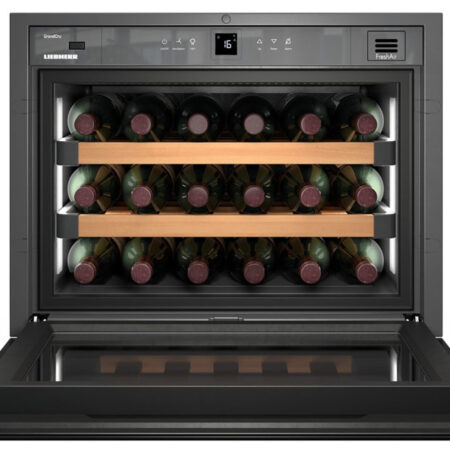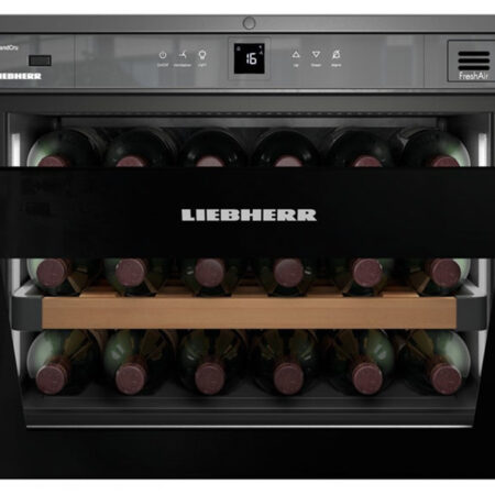 Liebherr WKEgb 582 GrandCru. Apparaatplaatsing: Ingebouwd, Kleur behuizing: Zwart, Inwendige kleur: Zwart. Flessen-capaciteit: 18 fles(sen), Type product: Thermo-elektrische wijnkoeler, Temperatuur bereik (zone 1): 5 – 20 °C. Lichtregeling: Interne schakelaar, Soort bediening: Touch, Type beeldscherm: LCD. Jaarlijks energieverbruik: 106 kWu, Stroomgebruik per dag: 0,29 kWh/24u, AC-ingangsspanning: 220-240 V. Breedte: 450 mm, Diepte: 560 mm, Hoogte: 550 mm