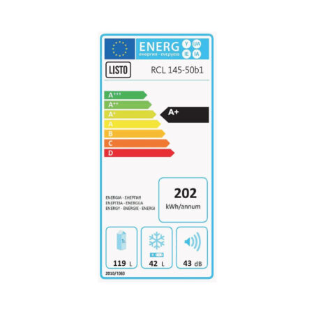 LISTO RCL 145-50B4. Totale nettocapaciteit: 161 l. Deurscharnieren: Rechts. Klimaatklasse: ST, Geluidsniveau: 43 dB. Nettocapaciteit koelkast: 119 l, Koelkast binnenverlichting, Aantal planken koelkast: 3, Aantal groente lades: 1. Nettocapaciteit vriezer: 42 l, Vriescapaciteit: 3 kg/24u. Jaarlijks energieverbruik: 202 kWu. Kleur van het product: Wit