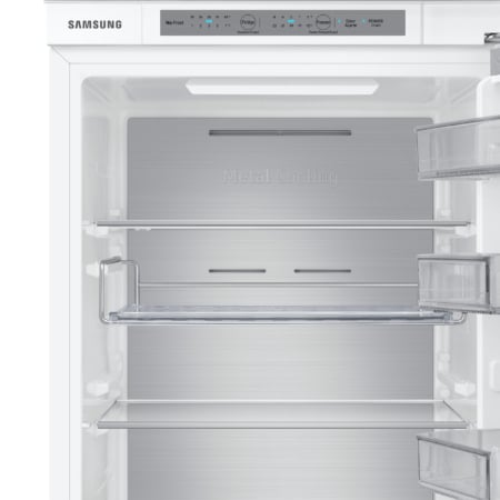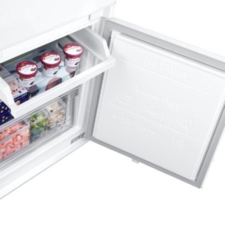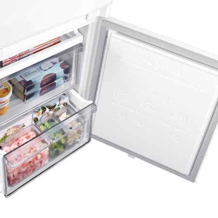 De Samsung BRB26705EWW deel je in zoals het jou uitkomt. Deze inbouw koel-vriescombinatie heeft SmartSpace deurvakken, waarmee je de indeling van de vakken gemakkelijk aanpast naar jouw wensen. Met SpaceMax bewaar je gemakkelijk de boodschappen van 3 of 4 personen, zonder dat het apparaat veel ruimte in beslag neemt. En dankzij het All Around Cooling systeem blijft de koeltemperatuur constant. Hierdoor gooi je minder eten weg. Maak gebruik van supervriezen om snel grote hoeveelheden in te vriezen. De vriesruimte blijft dan op temperatuur, zodat ingevroren producten niet ontdooien en langer goed blijven. No Frost zorgt ervoor dat jouw pizzadozen in de 3 vrieslades vrij blijven van ijs. Hierdoor hoef je de koel-vriescombinatie niet te ontdooien en blijft deze relatief zuinig