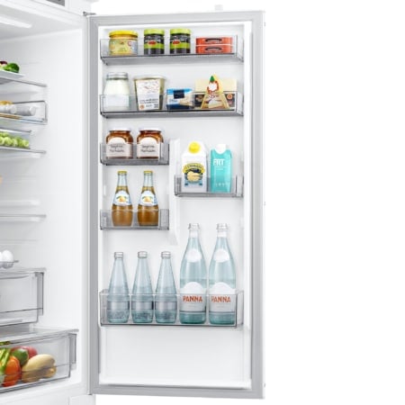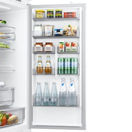 Samsung BRB30705EWW. Deurscharnieren: Rechts. Klimaatklasse: SN-T, Geluidsniveau: 35 dB. No Frost (koelkast), Koelkast binnenverlichting, Aantal planken koelkast: 4, Aantal groente lades: 2. Vriescapaciteit: 6 kg/24u, No Frost (vriezer). Vers zone compartiment. Energie-efficiëntieklasse: E, Jaarlijks energieverbruik: 229 kWu. Kleur van het product: Wit