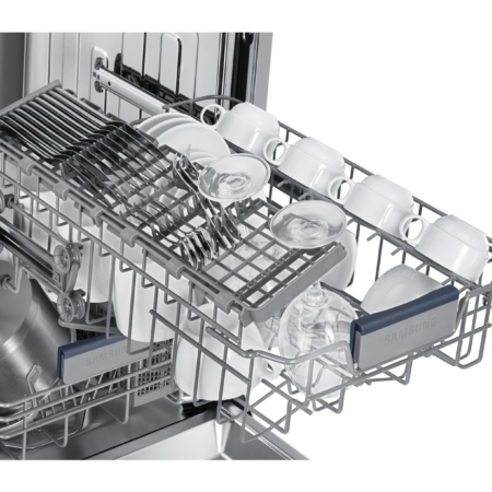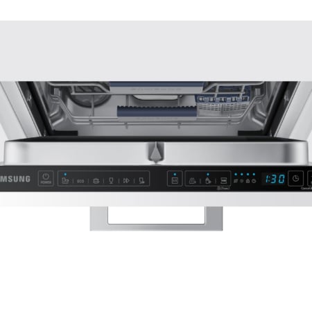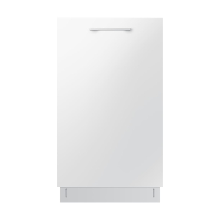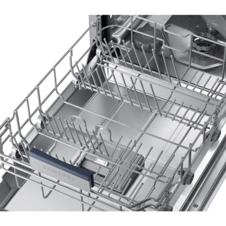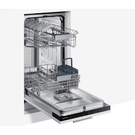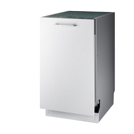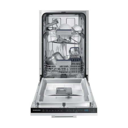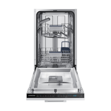 Samsung DW50R4040BB. Apparaatplaatsing: Volledig ingebouwd, Productafmeting: Slimline (45 cm), Kleur bedieningspaneel: Zwart. Aantal couverts: 9 couverts, Geluidsemissieklasse: C, Geluidsniveau: 46 dB. Voetenverstelling: 5 cm. Energie-efficiëntieklasse: F, Waterconsumptie per cyclus: 9,5 l, Energieverbruik per 100 cycli: 78 kWu. Breedte: 450 mm, Diepte: 550 mm, Hoogte: 815 mm