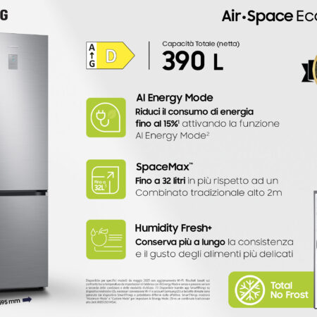 Samsung RB38C776DS9. Deurscharnieren: Rechts. Klimaatklasse: SN-T, Geluidsniveau: 35 dB. No Frost (koelkast), Koelkast binnenverlichting, Aantal planken koelkast: 4, Aantal groente lades: 2. Vriescapaciteit: 8 kg/24u, No Frost (vriezer). Vers zone compartiment. Energie-efficiëntieklasse: D, Jaarlijks energieverbruik: 211 kWu. Kleur van het product: Roestvrijstaal
