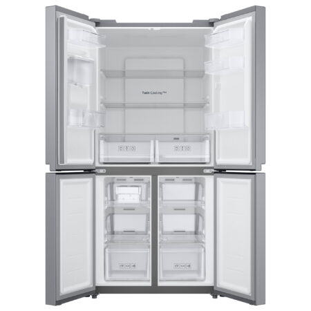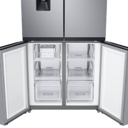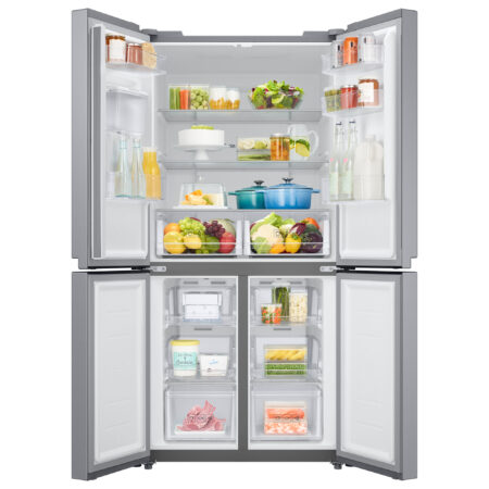 Samsung RF48A401EM9. Apparaatplaatsing: Vrijstaand, Productontwerp: Frans deur, Kleur van het product: Roestvrijstaal. Klimaatklasse: SN-T, Geluidsemissieklasse: C, Geluidsniveau: 41 dB. Brutocapaciteit koelkast: 329 l, Soort lamp: LED. Vriezer positie: Onder, Vriescapaciteit: 12 kg/24u, Aantal sterren: 4*. Energie-efficiëntieklasse: E, Jaarlijks energieverbruik: 298 kWu, Energie-efficiëntieschaal: A tot G
