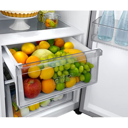 Samsung RR39C7BH5S9. Nettocapaciteit koelkast: 387 l, No Frost system, Klimaatklasse: SN-ST, Geluidsniveau: 39 dB. Aantal planken koelkast: 5, Aantal groente lades: 2. Soort lamp: LED. Jaarlijks energieverbruik: 120 kWu, Energie-efficiëntieklasse: E. Gewicht: 69 kg. Kleur van het product: Roestvrijstaal