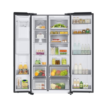 Samsung RS68A884CB1. Apparaatplaatsing: Vrijstaand, Productontwerp: Amerikaanse deur, Kleur van het product: Zwart. Klimaatklasse: SN-T, Geluidsemissieklasse: B, Geluidsniveau: 35 dB. Brutocapaciteit koelkast: 409 l. Vriezer positie: Ernaast, Vriescapaciteit: 15 kg/24u, Bewaartijd bij stroomuitval: 7 uur. Energie-efficiëntieklasse: C, Jaarlijks energieverbruik: 225 kWu, Energie-efficiëntieschaal: A tot G