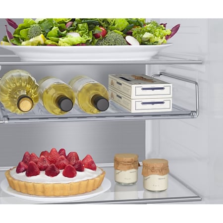 De moderne uitstraling past perfect bij jouw keukenapparatuur en keukenkasten en creëert een stijlvolle inrichting van je keuken. Het minimalistische ontwerp beschikt over platte deuren, geïntegreerde handgrepen, een verborgen display, een flessenplateau en grijze vakken voor etenswaren.