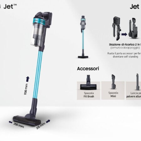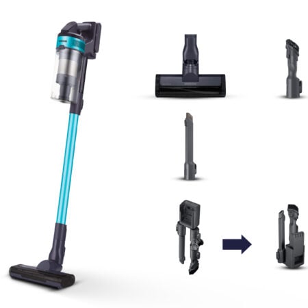 Samsung VS15A6031R1. Type product: Steelstofzuiger, Stofzuigercontainer type: Zakloos, Kleur van het product: Zwart, Muntkleur. Soort reiniging: Droog, Vuilafscheidingsmethode: Multi-cyclonisch, Geluidsniveau: 86 dB. Stroombron: Batterij/Accu, Maximaal ingangsvermogen: 410 W, Batterijtechnologie: Lithium-Ion (Li-Ion). Breedte verpakking: 800 mm, Diepte verpakking: 450 mm, Hoogte verpakking: 150 mm. Breedte: 250 mm, Diepte: 203 mm, Hoogte: 1120 mm