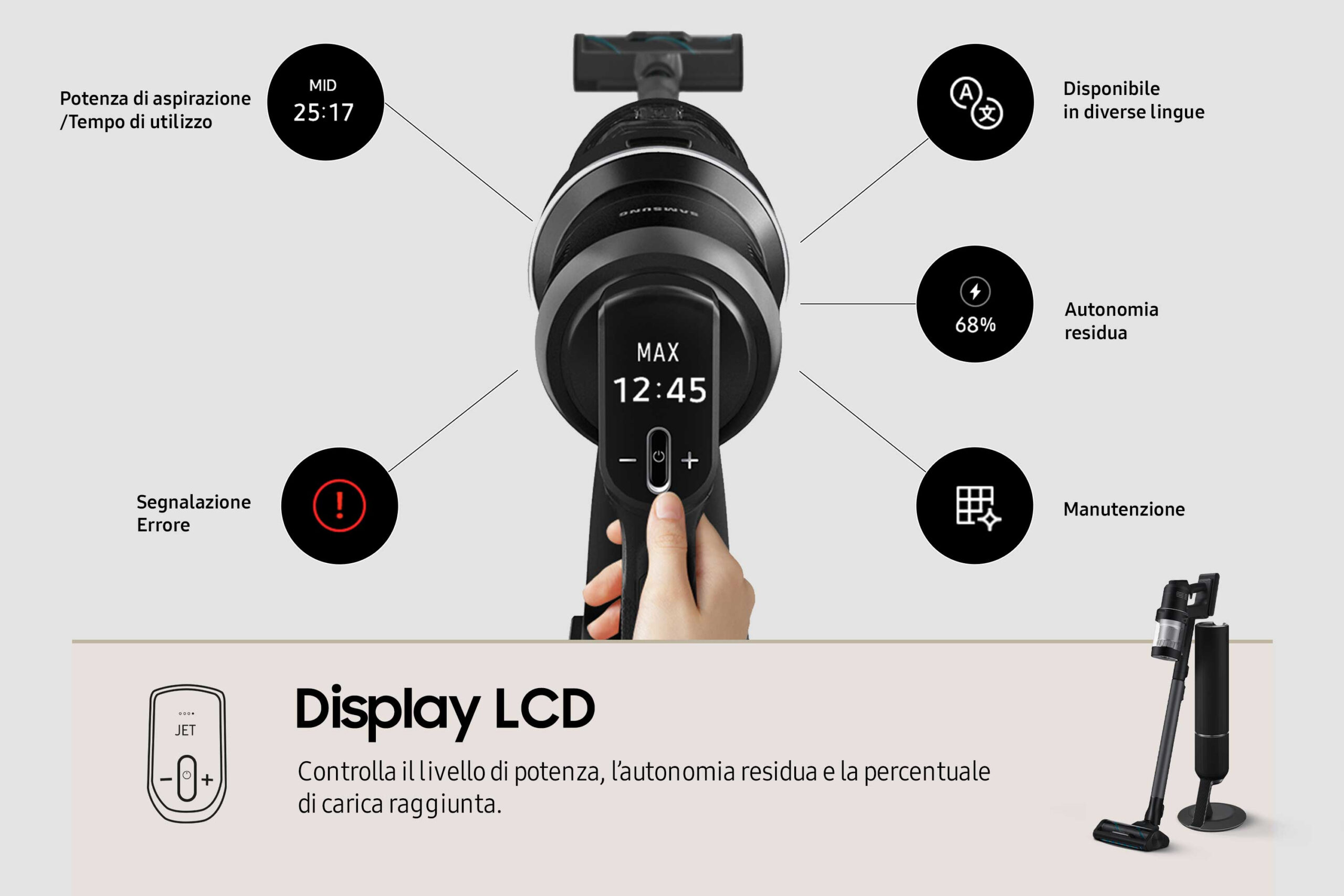 Bedien en onderhoud de stofzuiger intuïtiever met het LCD digitale display, dat diverse talen ondersteunt. Je ziet het zuigkrachtniveau en het batterijvermogen[18] in één oogopslag. Ook geeft hij eventuele problemen weer en biedt oplossingen. Tijdens het opladen geeft hij het oplaadpercentage weer.