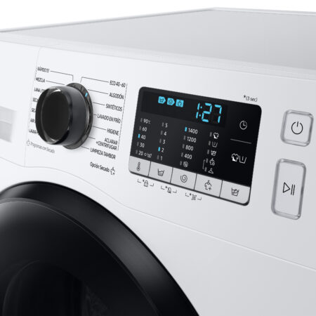 Samsung WD90TA046BE, Voorbelading, Vrijstaand, Wit, Links, Knoppen, Draaiknop, LED