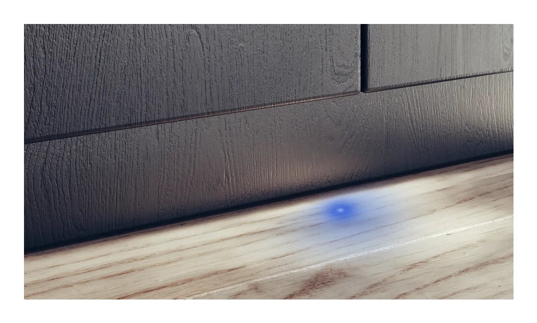 infoLight projecteert een blauwe stip op de keukenvloer zolang het afwasprogramma bezig is.