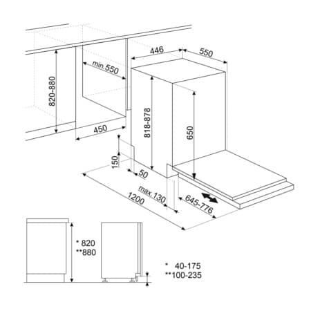 Smeg ST4522IN. Apparaatplaatsing: Volledig ingebouwd, Productafmeting: Slimline (45 cm), . Aantal couverts: 9 couverts, Geluidsemissieklasse: C, Geluidsniveau: 46 dB. Voetenverstelling: 6 cm. Energie-efficiëntieklasse: E, Waterconsumptie per cyclus: 9,9 l, Energieverbruik per 100 cycli: 70 kWu. Breedte: 446 mm, Diepte: 550 mm, Hoogte: 818 mm