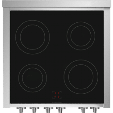 De kookplaat heeft vier inductiezones die verschillen in grootte en vermogen. De zones worden bediend met de grote metalen draaiknoppen aan de voorzijde van het fornuis. Op het kookvlak zelf wordt de ingegeven stand en de rest warmte indicatior weergegeven.