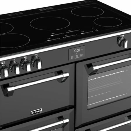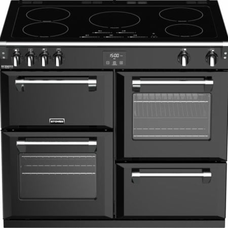 De Stoves Richmond S1000 EI Deluxe zwart is een zwart fornuis van 100 cm. breed, uitgevoerd met inductie kookgedeelte met vijf zones en daaronder vier verschillende ovens van verschillende grootte en met verschillende functies. Het fornuis heeft een landelijke, maar strakke uitstraling.